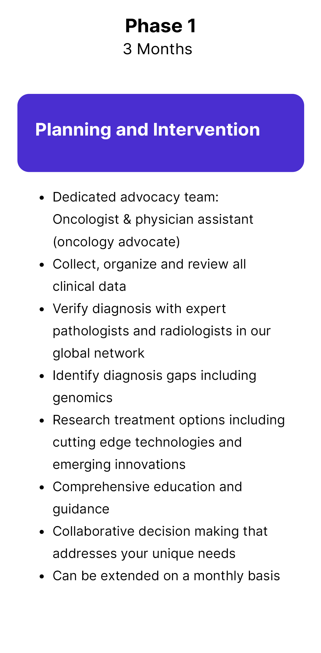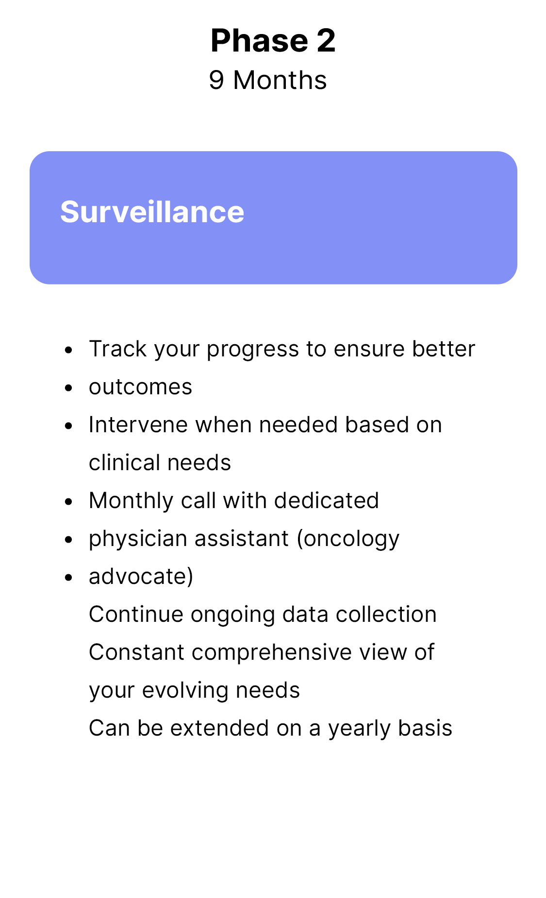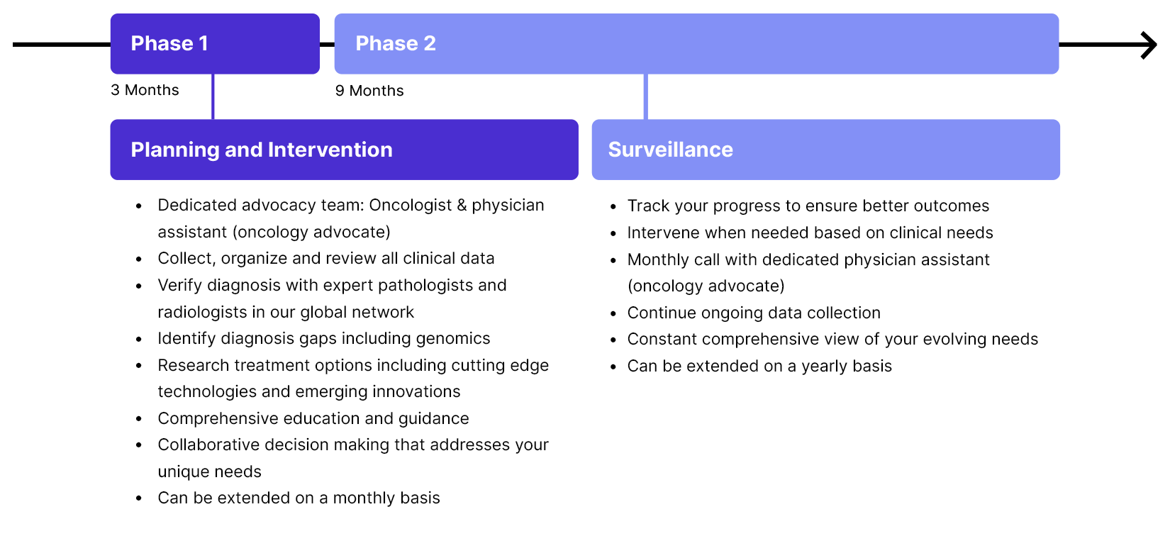 The service starts with a 3-month Planning & Intervention phase. Depending on your condition, this phase can be extended to address your unique needs. The next phase is the 9-month Surveillance phase. You will proceed to this phase after discussing it with your advocacy team and determining that it is the right decision for you. During the surveillance phase the advocacy team continues to support you and, if needed, will discuss the option to resume an additional Planning & Intervention phase.